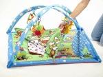 К мягким дугам центра на кольцах подвешиваются 5 развивающих игрушек: бабочки-прорезыватели; погремушки – солнышко, собачка и цветочек; а также вибрирующий паровозик. В развивающем центре есть так же безопасное зеркальце (диаметр 25 см). Все игрушки выполнены с использованием разнообразных текстильных материалов, которые способствуют развитию тактильных ощущений у малышей. Нажав на солнышко, изображённое на коврике, малыш услышит приятную мелодию. Под музыку солнышко и бабочки начинают по очереди мигать.